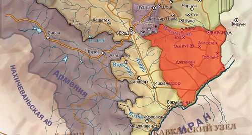 Нагорного Карабаха, с райцентром в Гадруте. На карабахских версиях карты региона город Джебраил обозначен армянским названием Джракан.)