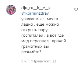 Некоторые пользователи считают, что помимо открытия госпиталей необходимо решить проблему с медицинскими кадрами. "Места, ладно, ещё можно открыть пару госпиталей. А вот где медперсонал, врачей грамотных вы возьмёте?" - написал dju_ru__k__e__k.