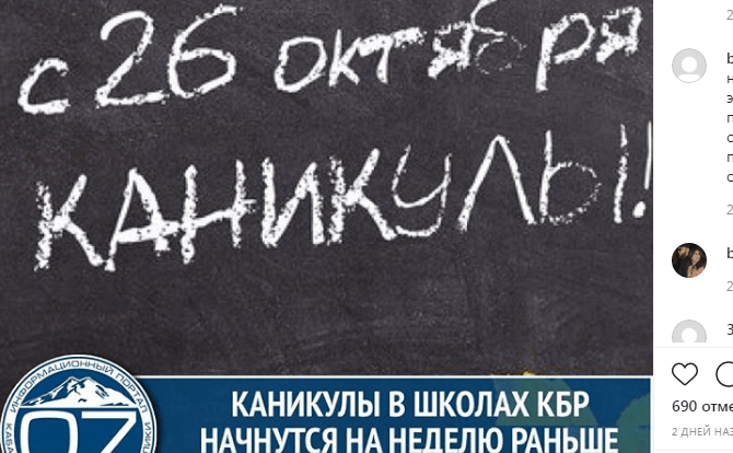 Видео, на котором глава республики Казбек Коков сообщает о решении продлить каникулы, было размещено 21 октября в Instagram на странице сообщества novosti.kbr, насчитывающей 39,1 тысячи подписчиков. По данным на 22.50 мск сегодня его посмотрели более 23 тысяч раз, пользователи оставили под ним 116 комментариев.