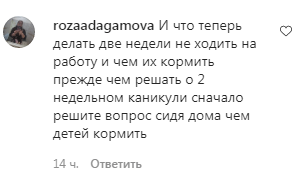 "И что теперь делать? Две недели не ходить на работу? И чем их (детей) кормить? Прежде чем решать (вопрос) о двухнедельных каникулах, сначала решите вопрос, чем, сидя дома, детей кормить", - возмутилась rozaadagamova.