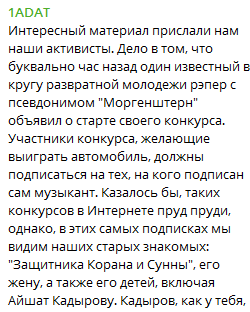 Ранее об участии семьи Кадырова в гиве сообщил Telegram-канал 1ADAT. "Один известный в кругу [...] молодежи рэпер с псевдонимом "Моргенштерн" объявил о старте своего конкурса. Участники конкурса, желающие выиграть автомобиль, должны подписаться на тех, на кого подписан сам музыкант. Казалось бы, таких конкурсов в Интернете пруд пруди, однако, в этих самых подписках мы видим наших старых знакомых: "Защитника Корана и Сунны", его жену, а также его детей, включая Айшат Кадырову", - говорилось 6 октября в сообщении на канале.