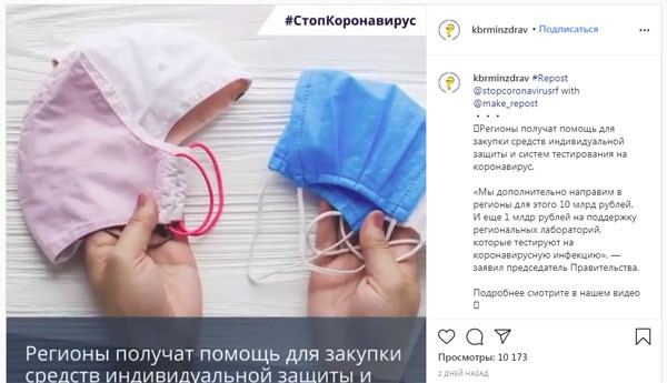 5 ноября на странице Минздрава Кабардино-Балкарии в Instagram было опубликовано сообщение, что регионы получат помощь для закупки средств индивидуальной защиты и систем тестирования на коронавирус. "Мы дополнительно направим в регионы для этого 10 млрд рублей. И еще 1 млрд рублей на поддержку региональных лабораторий, которые тестируют на коронавирусную инфекцию", – приведены в сообщении слова председатель правительства России Михаила Мишустина.