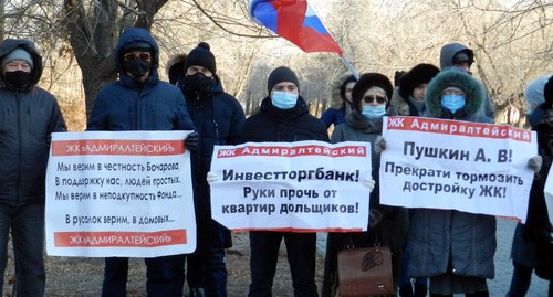 Как сообщал "Кавказский узел", более сотни дольщиков недостроенного ЖК "Адмиралтейский" вышли сегодня в Волгограде на акцию протеста против бездействия властей и потребовали ввести их дома в эксплуатацию. Участники акции отметили, что один из домов власти обещали сдать в декабре этого года, но строительные работы местным подрядчиком прекращены. После акции дольщики на нескольких десятках машин провели автопробег. Одного из участников пробега, Евгения Крылова, доставили в отделение полиции, но силовики ограничились протоколом о проезде на красный свет.