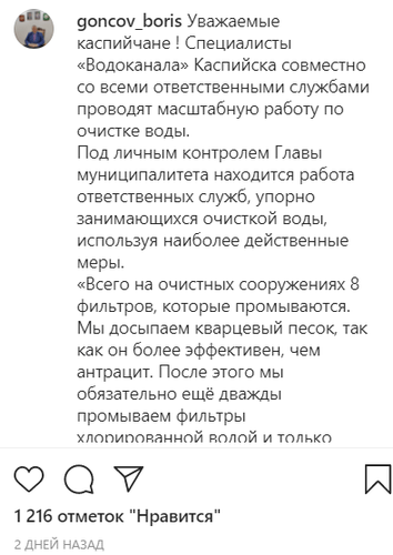 Мэр Каспийска Борис Гонцов 13 декабря на своей странице в Instagram написал, что в ближайшие сутки Каспийск получит чистую воду. Специалисты водоканала совместно со всеми ответственными службами проводят масштабную работу по очистке воды – промывке фильтров и отстойников, сообщил мэр. Он также отметил, что обсудил с сотрудниками Минмелиоводхоза Дагестана, в ведении которого находится эксплуатация канала Октябрьской Революции, важность вопроса с контролем сбросов в КОР.