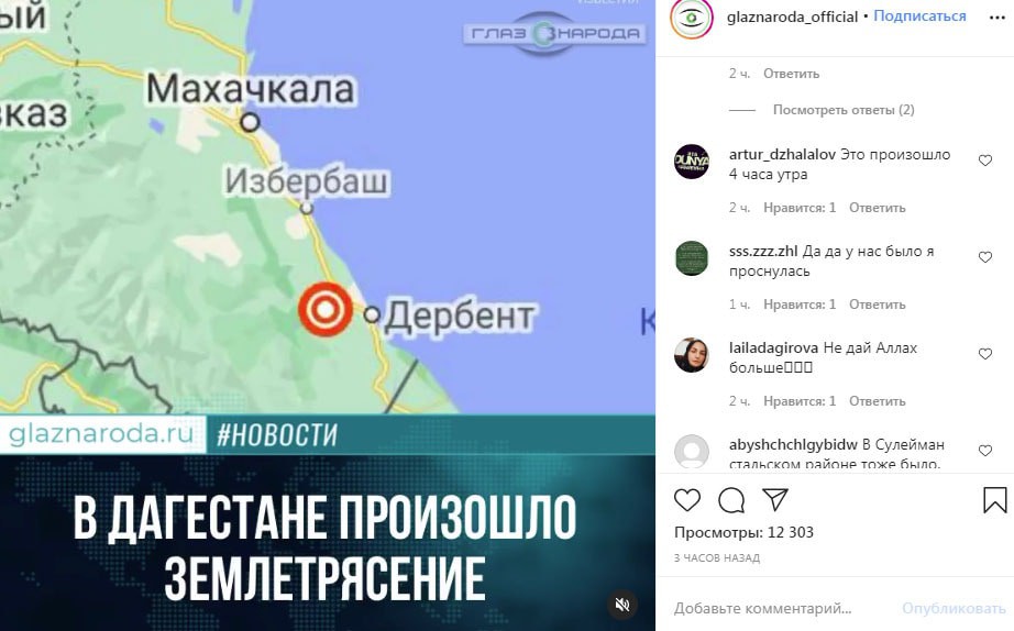 Информация о землетрясении также была опубликована сегодня и на странице Instagram-паблика glaznaroda_official, на который подписано около 87,6 тысячи пользователей. К 11.40 мск запись набрала 12,3 тысячи просмотров и 60 комментариев.