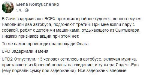 Силовики в Сочи задерживали "всех прохожих" близ художественного музея, рассказала Елена Костюченко на своей странице в Facebook. "Наполнили два автобуса, подгоняют третий. При мне взяли пару с собакой, ребят с детскими машинками, отдыхающего из Сыктывкара. Никаких признаков акции при этом нет. То же самое происходит на площади Флага", - написала она.