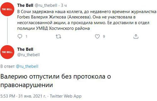 Также в Сочи была задержана журналистка The Bell Валерия Житкова, сообщили ее коллеги на странице издания в Twitter. "В Сочи задержана наша коллега, до недавнего времени журналистка Forbes Валерия Житкова (Алексеева). Она не участвовала в несогласованной акции, а проходила мимо. Ее доставили в отдел полиции УМВД Хостинского района", - говорится в сообщении.