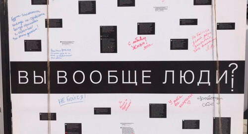 По словам Алисы Гокоевой, она предлагает выбрать во фразе "Вы вообще люди" интонацию и знак препинания самому зрителю. Фотограф рассказала, что при подготовке к выставке ей в соцсетях поступали угрозы.