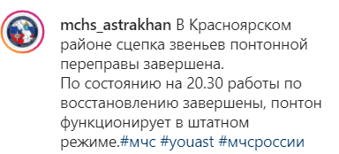 "В Красноярском районе сцепка звеньев понтонной переправы завершена. По состоянию на 20.30 мск (по местному времени, 19.30 мск) работы по восстановлению завершены, понтон функционирует в штатном режиме", - сообщило 9 марта Главное управление МЧС по Астраханской области на своей странице в Instagram.