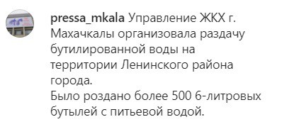 "Управление ЖКХ г. Махачкалы организовало раздачу бутилированной воды на территории Ленинского района города. Было роздано более 500 шестилитровых бутылей с питьевой водой", – сообщила ранее администрация Махачкалы в Instagram. "Была организована доставка бутилированной воды для питья для жителей Ленинского района. За что мы и благодарим", – говорит на видео мужчина. По данным на 21.40 мск сегодня, пользователи посмотрели видео 3095 раз и оставили под ним 45 комментариев. Большинство авторов комментариев возмутили его слова.