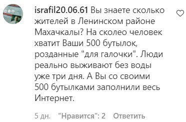 "Вы знаете сколько жителей в Ленинском районе Махачкалы? На сколько человек хватит ваших 500 бутылок, розданных "для галочки". Люди реально выживают без воды уже три дня. А вы со своими 500 бутылками заполнили весь Интернет", - возмутился israfil20.06.61.