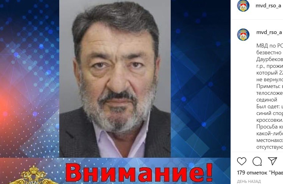 Торчинов пропал 22 марта в районе бесланского ипподрома. "Разыскивается безвестно отсутствующий Тамерлан Даурбекович Торчинов, дата рождения 2 августа1956 года, проживающий в г. Беслане, который 22 марта 2021 года ушел из дома и не вернулся", - сообщило МВД по Северной Осетии на своей странице в Instagram.