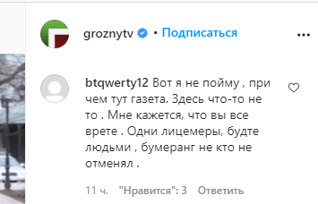 "То, что ни стыда, ни совести у вас, это понятно, но побойтесь Аллаха, он скор в расчетах. Вам уже никто не верит, от ваших дешёвых спектаклей уже тошнит", - написал пользователь ___cosa.nostra__.