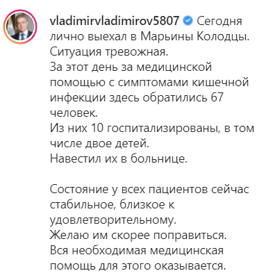 "В селе сейчас... организован подвоз питьевой воды. Проводятся подворовые обходы – жителей предупреждают о том, что не стоит пить из-под крана сырую воду, а в случае проявления недомогания сразу обращаться к врачам", - написал Владимиров.