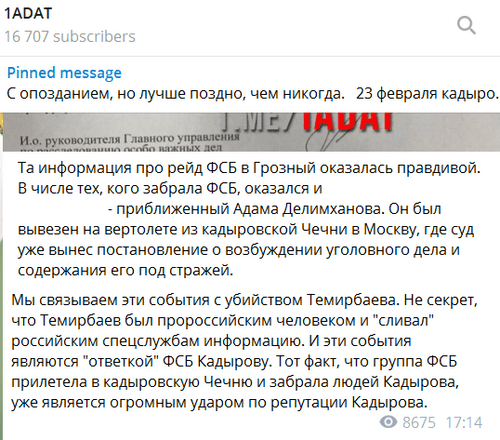 В нем также утверждается, что с гибелью Темирбаева связан недавний рейд ФСБ в Грозный. "В числе тех, кого забрала ФСБ, оказался и [...] – приближенный Адама Делимханова. Он был вывезен на вертолете из кадыровской Чечни в Москву, где суд уже вынес постановление о возбуждении уголовного дела и содержания его под стражей", – написал 1ADAT. В Telegram-канале опубликована копия постановления о возбуждении уголовного дела.