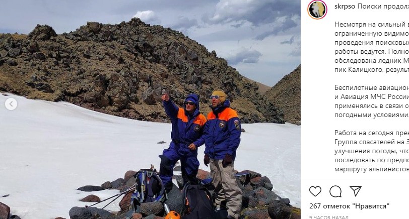 Из-за плохой погоды спасатели были вынуждены приостановить поиски пропавших на Эльбрусе альпинистов, написал сегодня на своей странице в Instagram Северо-Кавказский региональный поисково-спасательный отряд МЧС России. "Полностью обследован ледник Микельчиран и пик Калицкого, результатов нет. <…> Группа спасателей на 3800 ожидает улучшения погоды, чтобы последовать по предполагаемому маршруту альпинистов", – сказано в сообщении спасателей.