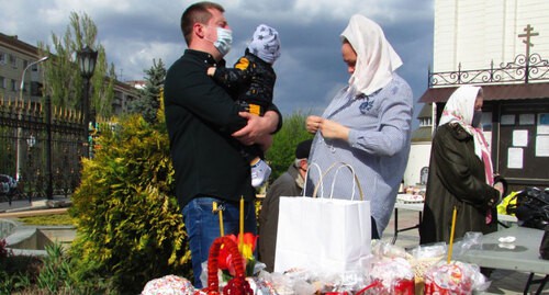 «Отстояли литургию. Сейчас ждем, когда батюшка выйдет и окропит куличи святой водой», - сказала корреспонденту «Кавказского узла» пенсионерка Елена Скоробогатова.