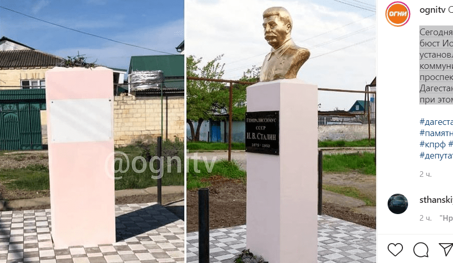 Как писал "Кавказский узел", 29 апреля в Дагестанских Огнях установили бюст Иосифа Сталина на постаменте. Коммунисты, установившие этот бюст, проявили неуважение к репрессированным народам Кавказа, заявили интернет-пользователи, а их оппоненты напомнили о роли Сталина в годы войны.