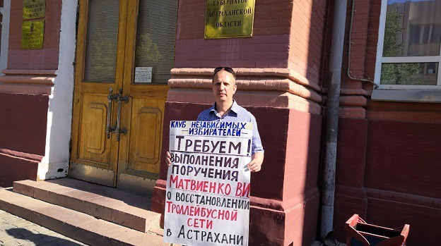 19 мая спикер Совета Федерации Валентины Матвиенко в ходе встречи с губернатором Астраханской области Игорем Бабушкиным высказалась в пользу возвращения троллейбусов в Астрахани, это актуализировало тему с общественным транспортом в Астрахани, сообщил корреспонденту "Кавказского узла" президент региональной общественной организации "Клуб независимых избирателей" Александр Марселин. Сегодня он был одним из тех, кто проводил пикет у администрации губернатора.