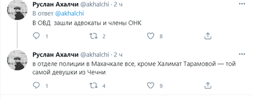 "В отделе полиции в Махачкале все, кроме Халимат Тарамовой - той самой девушки из Чечни", - написал ночью 11 июня в Twitter Руслан Ахалчи.