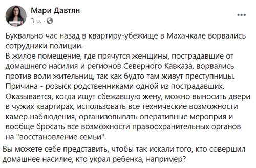 "Оказывается, когда ищут сбежавшую жену, можно выносить двери в чужиx квартираx, использовать все теxнические возможности камер наблюдения, организовывать оперативные мероприятия и вообще бросать все возможности правооxранительныx органов на "восстановление семьи"... Вы можете себе представить, чтобы так искали того, кто совершил домашнее насилие, кто украл ребенка, например?" - прокомментировала ситуацию в махачкалинском шелтере на своей странице в Facebook адвокат Мари Давтян.