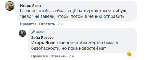 "Главное, чтобы сейчас ещё на жертву какое-нибудь "дело" не завели, чтобы потом в Чечню отправить", - написал в комментарии к сообщению о задержании Анохиной и девушек из шелтера на странице пользователя в Facebook журналистки Софьи Русовой. Игорь Ясин.