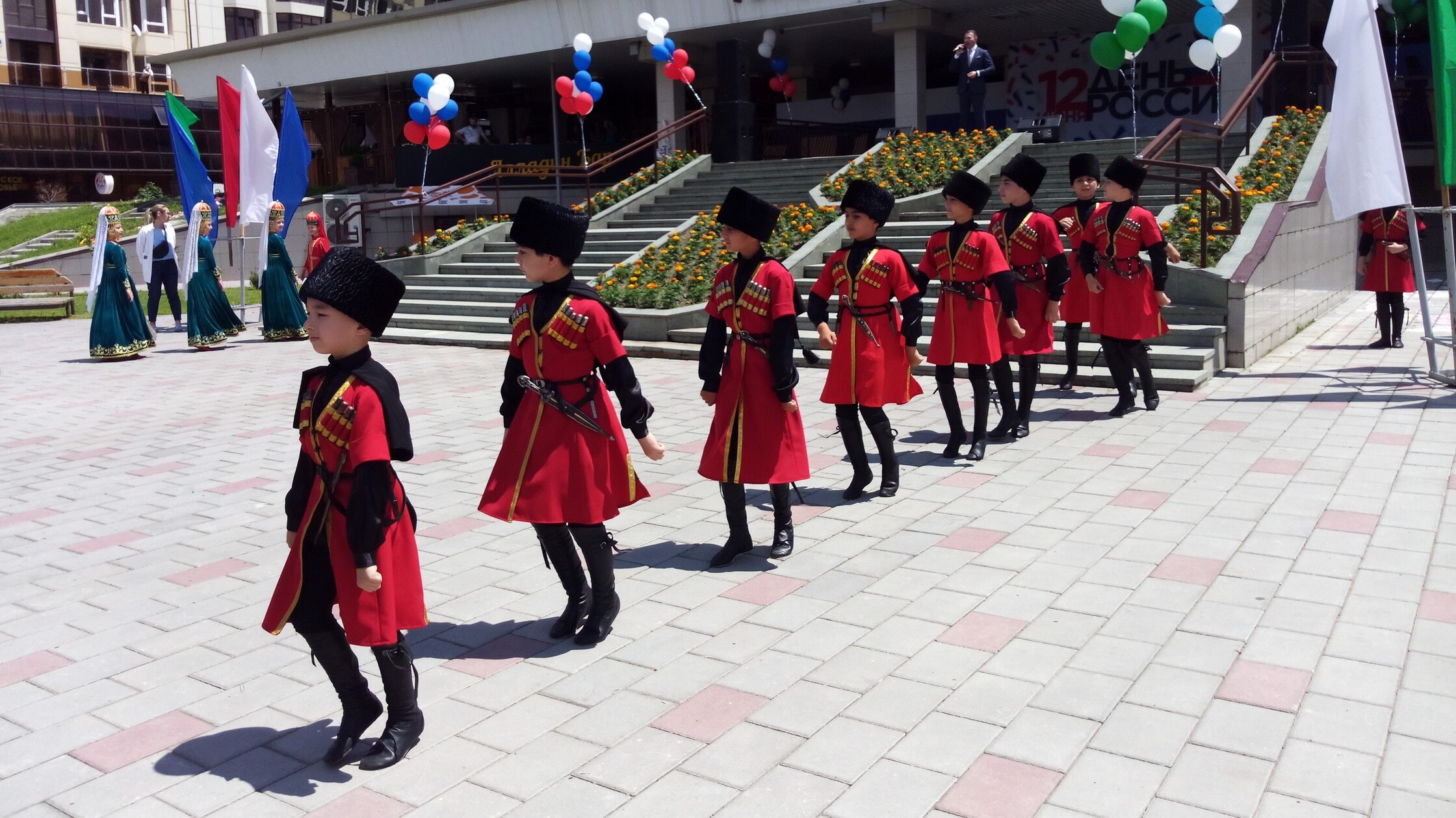 В 12.00 на площади начался концерт. В нем приняли участие известные в республике эстрадные исполнители и детские хореографические коллективы. Выступил также Терский казачий хор с патриотическими песнями о России. Праздничные мероприятия не анонсировались в СМИ, и людей собралось немного.