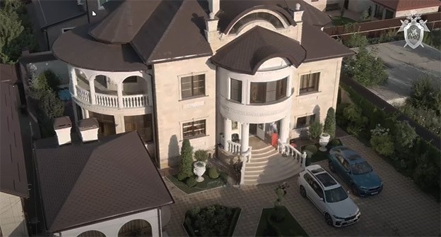 На YouTube-канале Следственного комитета России размещено видео, в котором показан особняк, около которого припаркованы две иномарки, и интерьеры помещений, обставленных золоченой мебелью.