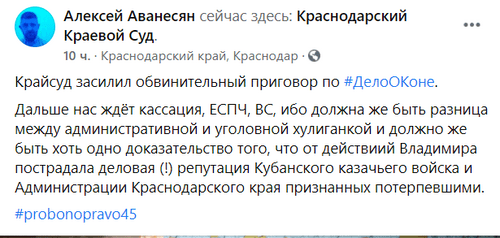"Дальше нас ждёт кассация, ЕСПЧ, ВС, ибо должна же быть разница между административной и уголовной хулиганкой, и должно же быть хоть одно доказательство того, что от действий Владимира пострадала деловая репутация Кубанского казачьего войска и администрации Краснодарского края, признанных потерпевшими", - написал Аванесян.