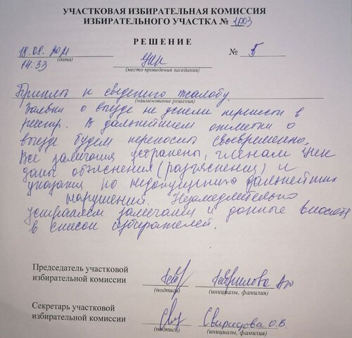 В жалобе в ТИК Центрального района Владимир Копырюлин указал, что "председатель УИК № 1003 в своем решении № 5 за 17 сентября 2021 года признал все нарушения, но отказал мне в удовлетворении жалобы".