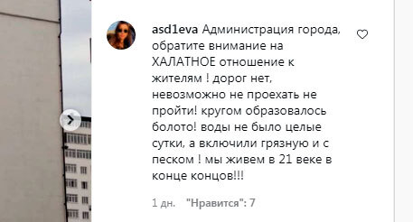 "Администрация города, обратите внимание на халатное отношение к жителям! Дорог нет, невозможно ни проехать, ни пройти. Кругом образовалось болото! Воды не было целые сутки, а включили грязную и с песком. Мы живем в 21 веке, в конце концов", – заявил пользователь asd1eva.