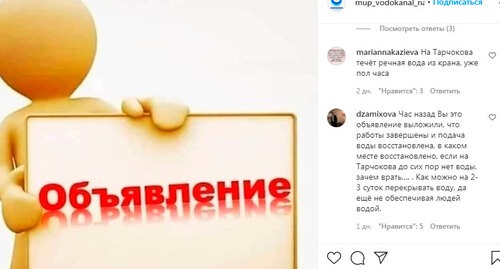 "Если вы не можете возобновить подачу воды уже сутки, то обеспечьте подвоз воды! Думаю, пора уже давать юридическую оценку действиям водоканала", – заявил пользователь meti_lura. "Мы уже сутки на Тарчокова, 19а без воды! Вы издеваетесь?" – спросил пользователь bellisimo_sh. "На Тарчокова, 19 до сих пор нет воды, вы издеваетесь?" – также задался вопросом пользователь taal_gh336699.
