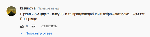 "В реальном цирке клоуны и то правдоподобней изображают бокс... чем тут! Позорище", - поддержал его kasumov ali.