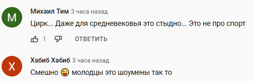 Авторы комментариев также назвали поединок "цирком". "Есть хороший цирк Юрия Никулина, где можно посмеяться от души. Теперь есть цирк Кадырова, тут тоже можно смеяться от души", - с иронией написал Сергей Калашников.