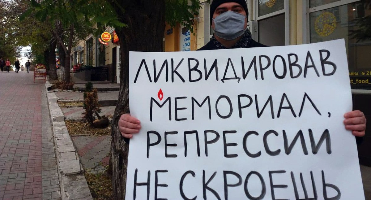 Попытки ликвидации "Международного Мемориала"* и Правозащитного центра "Мемориал"* связаны с их правозащитной деятельностью и работой по сохранению памяти о репрессиях, заявили активисты, которые провели сегодня одиночные пикеты в центре Астрахани.