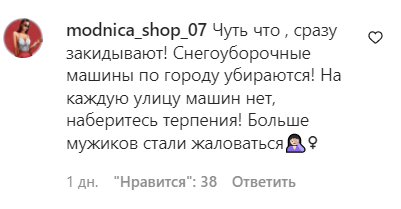 "Снегоуборочные машины по городу убираются! На каждую улицу машин нет, наберитесь терпения!" – написала modnica_shop_07.