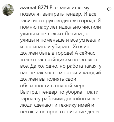"Все зависит (от того), кому позволят выиграть тендер. И все зависит от руководителя города. Я помню, пару лет идеально чистили улицы и не только Ленина, но улицы и поменьше, и все успевали и посыпать и убирать. Хозяин должен быть в городе! А сейчас только застройщикам позволяют все. Да, холодно, но работа такая, у нас не так часто морозы, и каждый должен выполнять свои обязанности в полной мере. Выиграл тендер по уборке – плати зарплату рабочим достойно, и все люди сделают. И технику имей, и песок, а не просто списание денег", – написал azamat.8271.