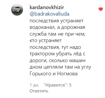 "Последствия (аварии) устраняет "Водоканал", а дорожная служба там ни при чем... тут надо трактором убрать лёд с дороги, сколько машин дном цепляли там на углу (улиц) Горького и Ногмова", – возразил им kardanovkhizir.