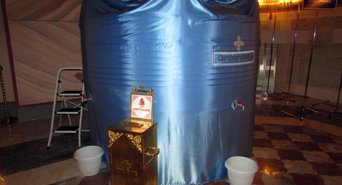 Корреспондент «Кавказского узла» побывал на службе в соборе Александра Невского. На входе стоял санитайзер и коробка с масками. Прихожан на вечерней молитве было немного. Рядом со входом был установлен огромный чан с водой. Любой желающий мог набрать из него освященной воды. На другом конце на столах были расставлены бутылки с водой. Средства от их продажи пойдут на благотворительность – об этом сообщает вывеска.