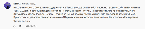 "Как могут мужчины Чечни, которые считают себя мусульманами, так поступать с женщинами, с мусульманками и с мусульманами [...] Так опозорить мусульманство и Коран", - написал Михаил Макеев, комментируя опубликованное на Youtube-канале "1ADAT** Активист" видео блогера Тумсо Абдурахманова, где он рассказывает о шантаже Хасана Халитова непристойными фото сестры. Канал насчитывает 937 подписчиков.