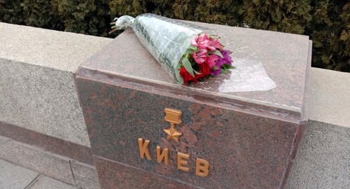 Спустя 15 минут сотрудник охраны мемориала переложил букет цветов с ниши "Киева" на соседнюю тумбу.
