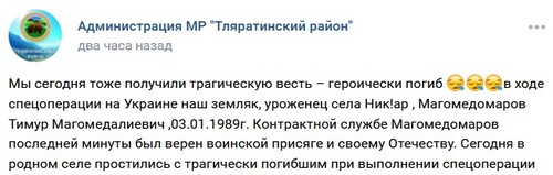 "Мы сегодня тоже получили трагическую весть – героически погиб в ходе спецоперации на Украине наш земляк, уроженец села Никар, Магомедомаров Тимур Магомедалиевич, 03.01.1989 г.", - говорится в публикации на странице администрации в "ВКонтакте". У Магомедомарова остались жена и двое детей, уточнили власти муниципалитета.