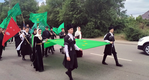 Сегодня в Черкесске прошли шествие и митинг, посвященные памяти жертв Кавказской войны. Люди собрались около ТЦ "Россия", после чего с флагами пошли по проспекту Ленина. На Ленина шли по тротуару, а свернув на улицу Демиденко, перешли на проезжую часть. Там шествие занимало половину проезжей части – правую, по ходу движения, а спереди и сзади шествия ехали в целях безопасности полицейские автомобили. Так, по проезжей части, прошла примерно половина шествия. Шествие продолжалось около часа, передал корреспондент "Кавказского узла".