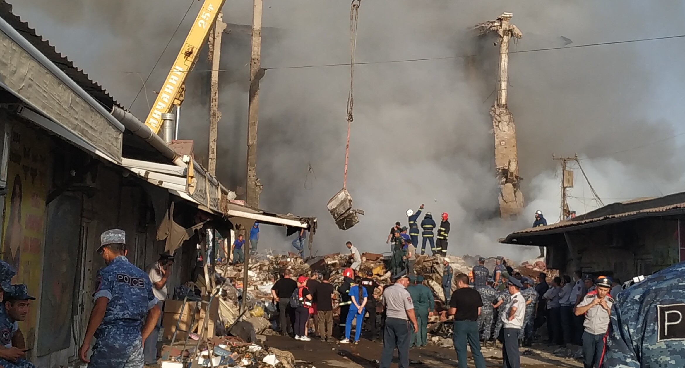 Как писал "Кавказский узел", взрыв произошел сегодня в оптово-розничном торговом центре "Сурмалу" в Ереване. После взрыва на складе фейерверков начался сильный пожар, часть здания обрушилась. Ранее сообщалось о двух погибших. Еще 50 человек, в том числе 11 детей, получили травмы, сообщили в МЧС.
