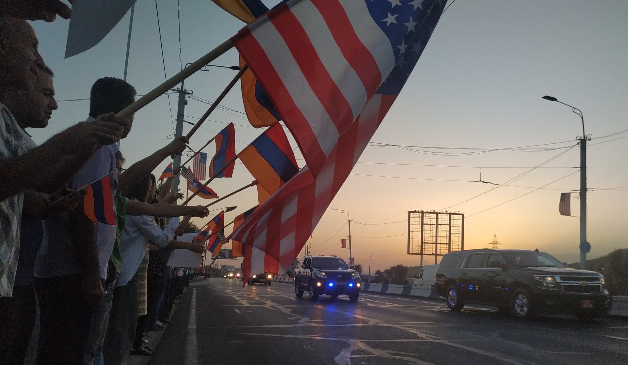 Нэнси Пелоси приветствовали группы людей на улицах, в Ереване были развешены американские флаги. На улице Исакова, близ посольства США, Нэнси Пелоси приветствовала группа, собравшаяся по призыву Национал-демократического полюса (НДП). Активисты держали в руках армянские и американские флаги, карту Вильсоновской Армении, а также плакаты Save Artsakh (Спасите Арцах (самоназвание Нагорного Карабаха - Прим. "Кавказского узла"), USA & Armenia are historical allies (США и Армения - исторические союзники), Thank you America! (Спасибо, Америка) и другие.
