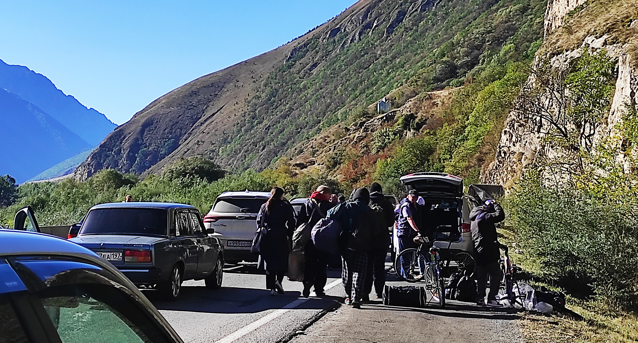 Людей без транспортных средств 26 сентября начали пропускать через границу с Грузией, после чего с российской стороны на пункте пропуска "Верхний Ларс" выстроилась огромная очередь из желающих перейти границу пешком, сообщил автор обнародованного в Telegram видео. Сотрудники полиции не пускают автомобили в сторону границы, и желающим выехать из России в Грузию приходится идти к пункту пропуска пешком или покупать велосипеды и скейтборды. Таксисты отказываются ехать к "Верхнему Ларсу" либо требуют за проезд слишком большие суммы, рассказали выезжающие.