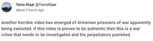 На публикацию видео расстрела отреагировал сегодня спецпредставитель ЕС по Южному Кавказу Тойво Клаар. "Появилось еще одно ужасное видео, на котором, по-видимому, казнят армянских военнопленных. Если будет доказано, что видео подлинное, то это военное преступление, которое должно быть расследовано, а виновные наказаны", - написал в Twitter Клаар, публикацию которого перевел на русский язык "Кавказский узел".