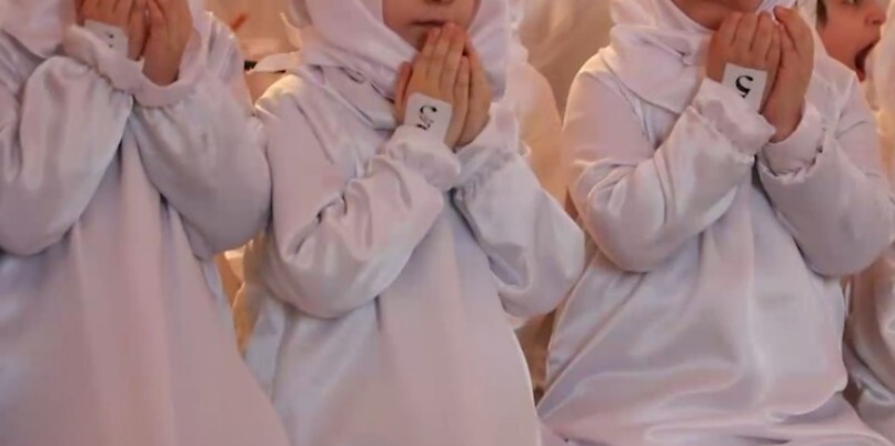 На ролике, опубликованном в Telegram-канале Кадырова, показаны кадры молитв, в том числе с участием детей дошкольного возраста. Больше всего времени в 39-секнудном ролике уделено именно детям. При этом в одном из фрагментов видео несколько десятков девочек одеты в хиджабы в цветах российского флага.