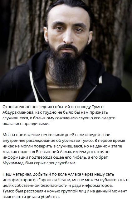 Сведения об убийстве Тумсо Абдурахманова выглядят достоверными, сообщил сегодня один из Telegram-каналов, критикующих власти Чечни. "Мы имеем достаточно информации, подтверждающей его гибель, а его брат, Мухаммад, был скрыт спецслужбами. <…> Тумсо был расстрелян ночью группой лиц, и на данный момент выясняются детали убийства", – говорится в сообщении.