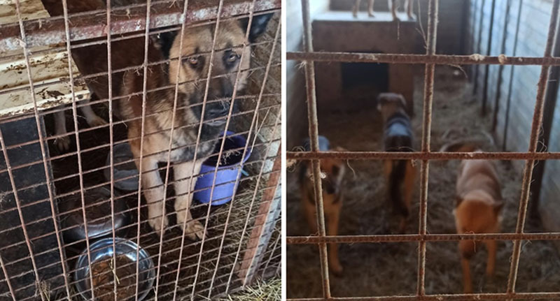 К записи также прикреплены фотографии, на которых показаны несколько человек в приюте для животных, собаки в клетках, некоторые из которых сильно истощены, также показан залитый жидкостью пол.
